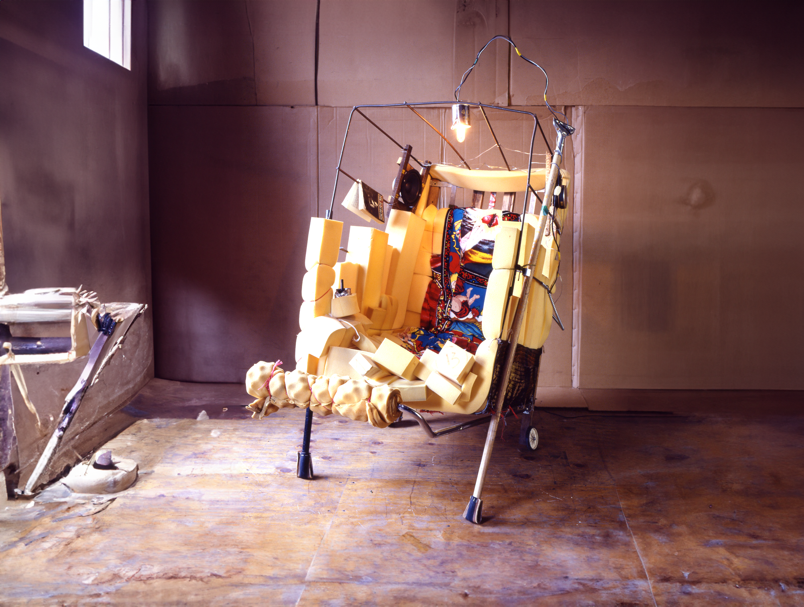 The tilted structure of a mail cart is transformed into a reclining lounger lined with scrap foam and equipped with stereo speakers and reading light.