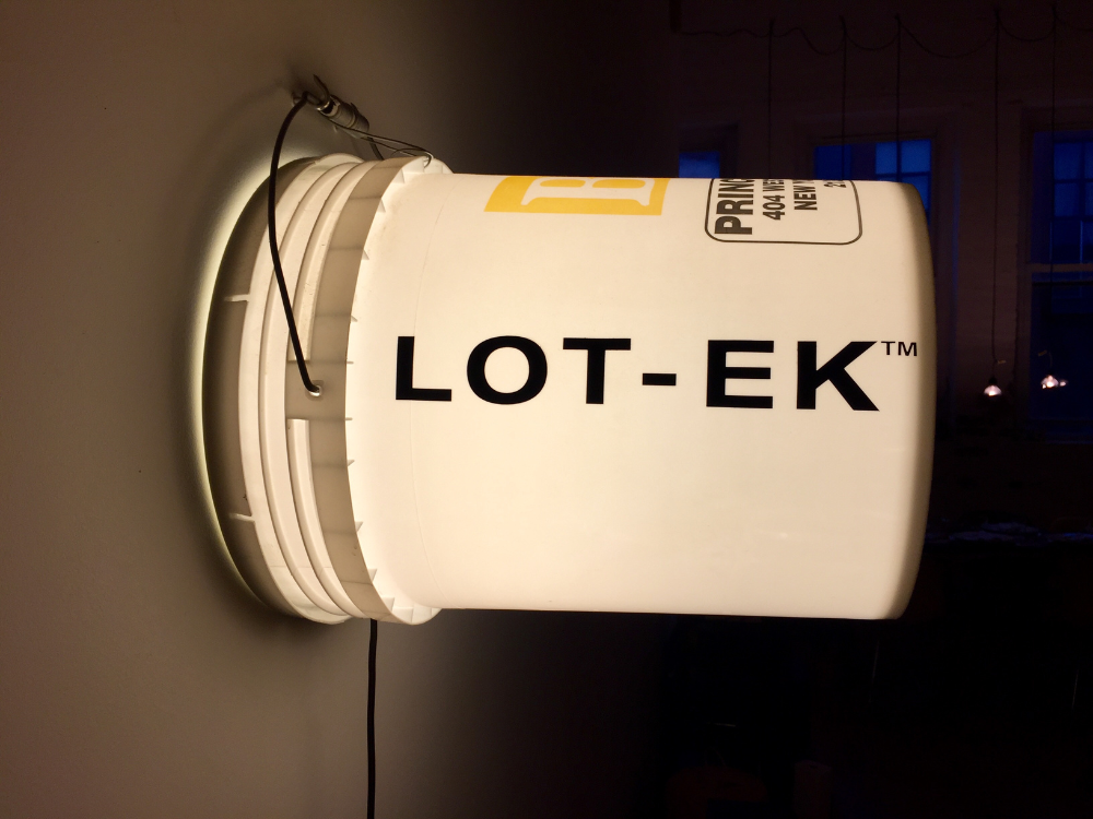 A generic plastic bucket is fitted with light, tilted on its side, and installed on the wall - hung on its own handle - as a wall sconce. White and orange buckets have been used for different mood and light.