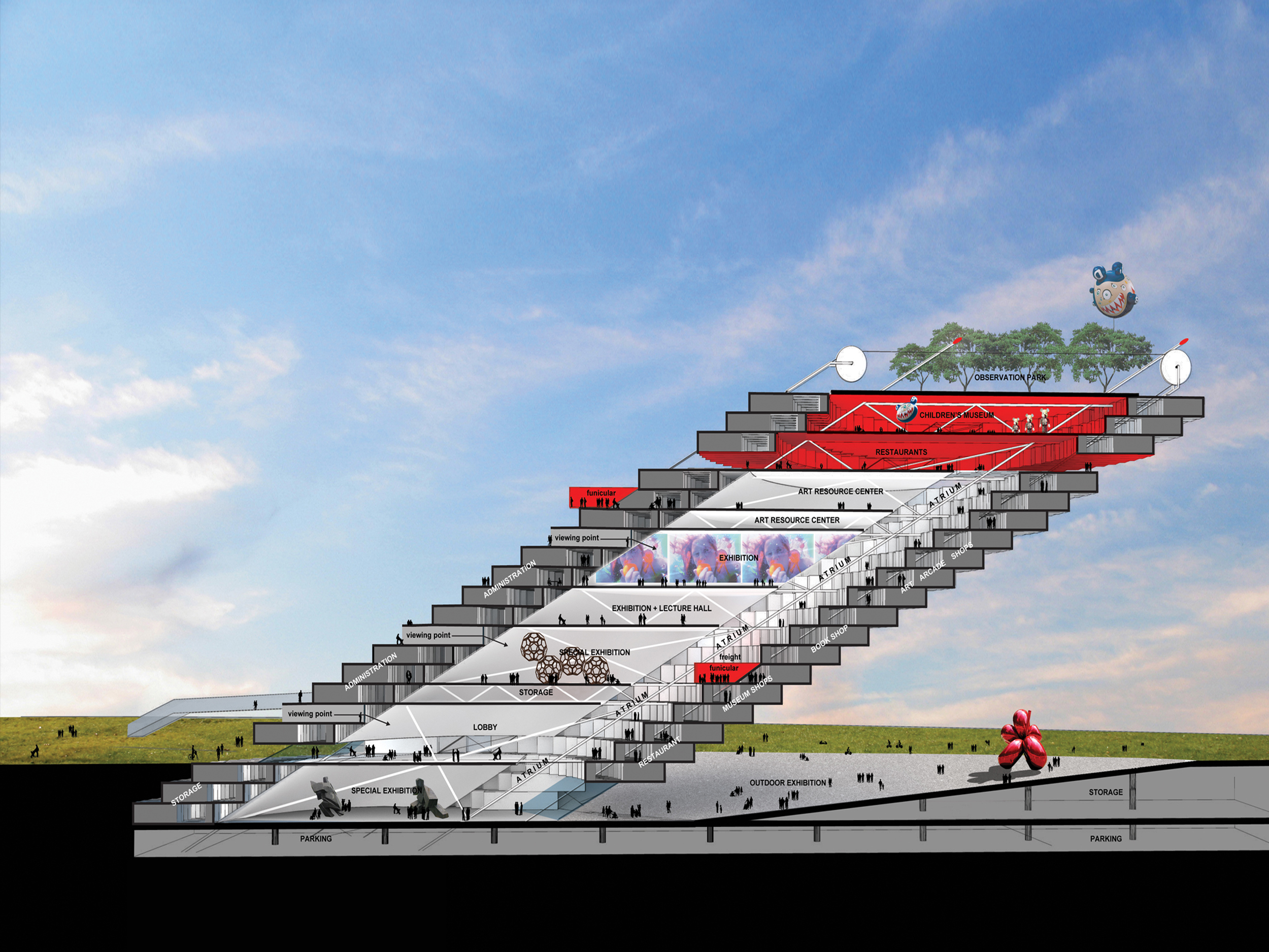 Approximately 1,100 shipping containers create the curved “walls” of the building. The stacked containers shift to create “stepped” edges, generating the strong volume of the museum as a sculpture – its arrow-like bulkhead floating over the landscape, transporting visitors towards the future of contemporary art. The design for the New Taipei City Museum of Art concentrates the entire program within a highly-visible single, iconic structure. The building is pierced by a walkway and bike-friendly passenger bridge, which functionally connect NTCArt to the surrounding setting. Externally, the program begins at ground level – where the striking cantilevered structure provides a protected and shaded pedestrian plaza underneath, perfect for resting, play and as an open-air sculpture garden. The exterior sunken plaza is connected to the underground level for special exhibitions. The museum entrance at ground level includes an open area, which functions as a lobby/information center. Triple-height exhibition spaces are designed to provide a variety of permanent exhibit halls and rooms. A Children’s Museum is located at the top level of the structure. The entrance lobby for the Children’s Museum is situated one level below, alongside entrances to two full-service restaurants. The very top level of NTCArt would serve as a planted observation deck/park. Offering a commanding view of the surrounding valley and beyond, the deck is accessed by a funicular system, which cuts through the two inclined sides of the structure to carry visitors up and down. Each container level serves as a grass-planted “step” for visitors to enjoy views of the area. A large digital display, with panels placed within the containers’ ends, transmits video art for those on the plaza, serving as a draw for passerby traveling on nearby roads.