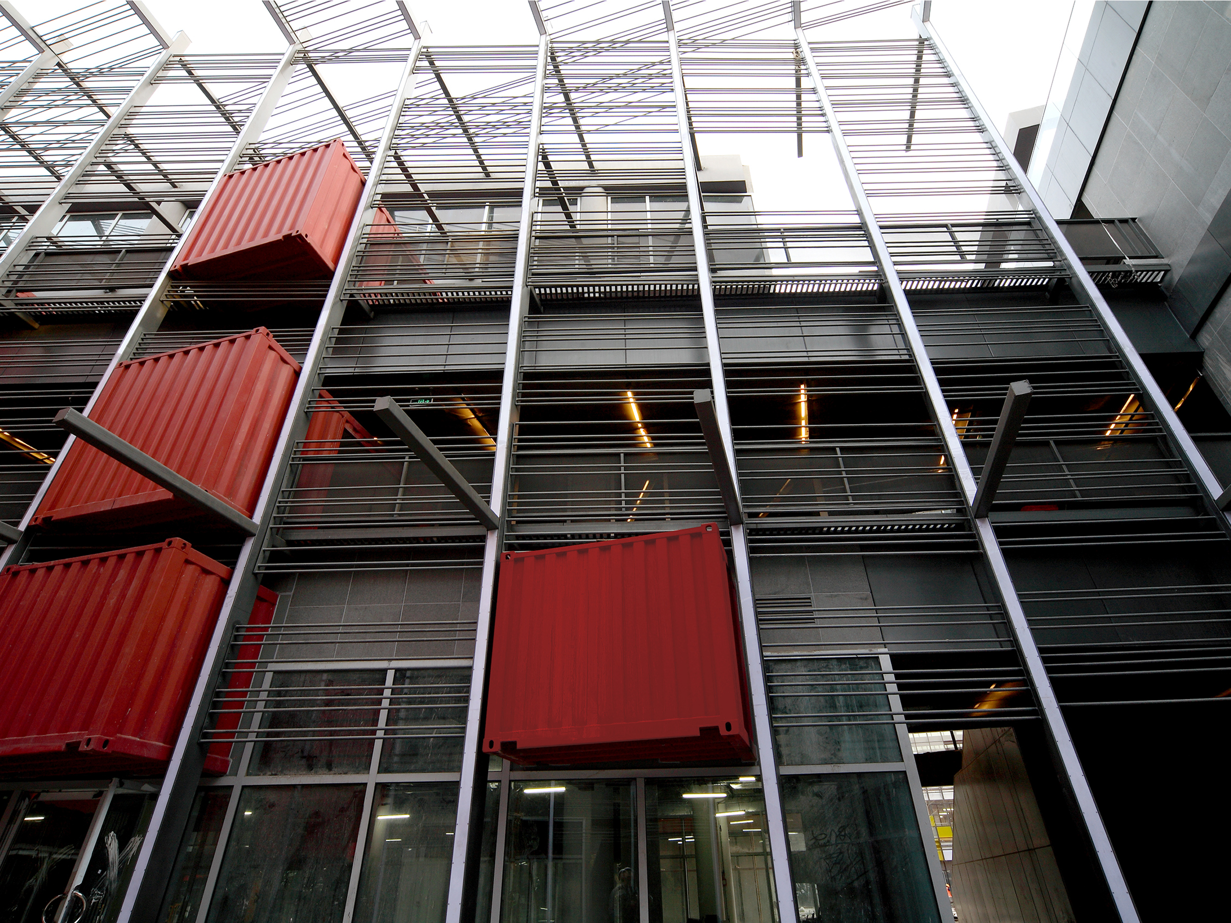 At the ground level, the containers act as canopies over store entrances, offering shaded areas and opportunities for displays or small interior functions. On the upper floors, they are pierced by horizontal circulation pathways, serving as entrances to retail spaces and as display windows along the loggias.