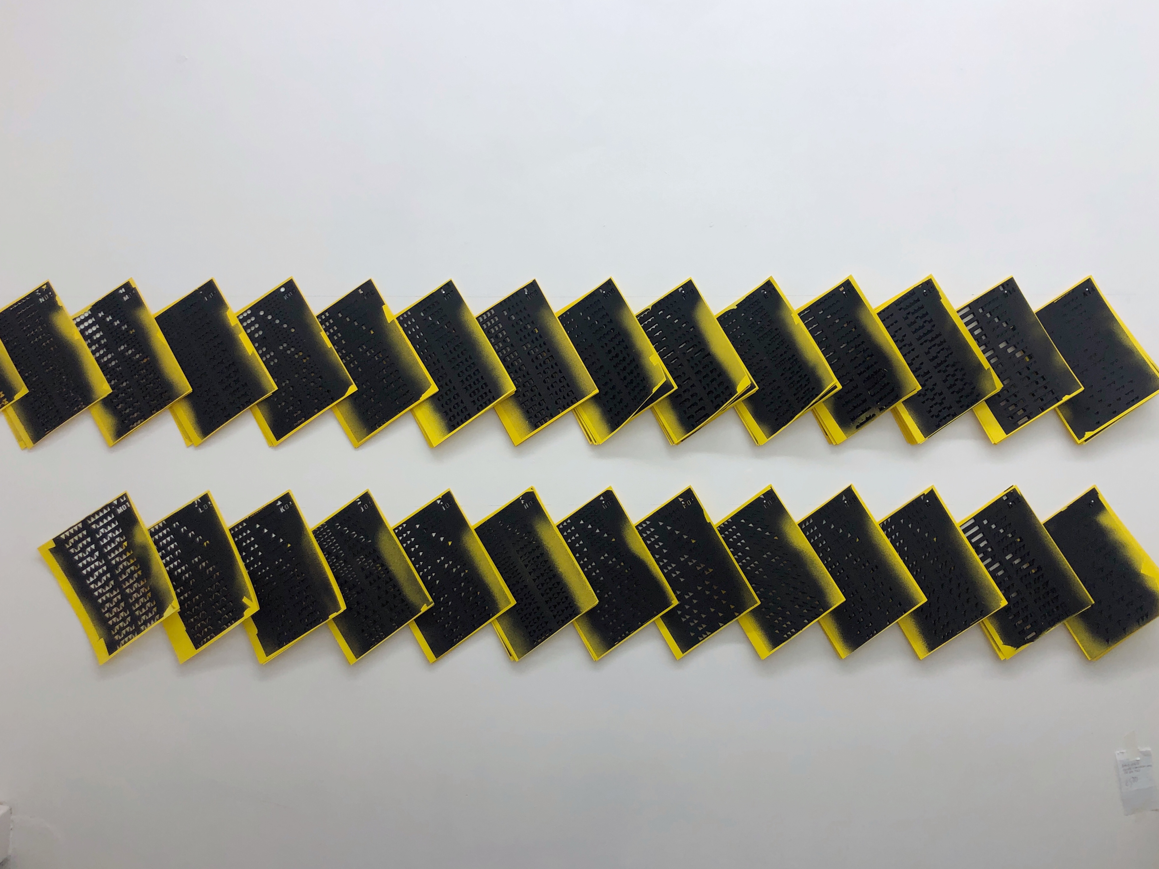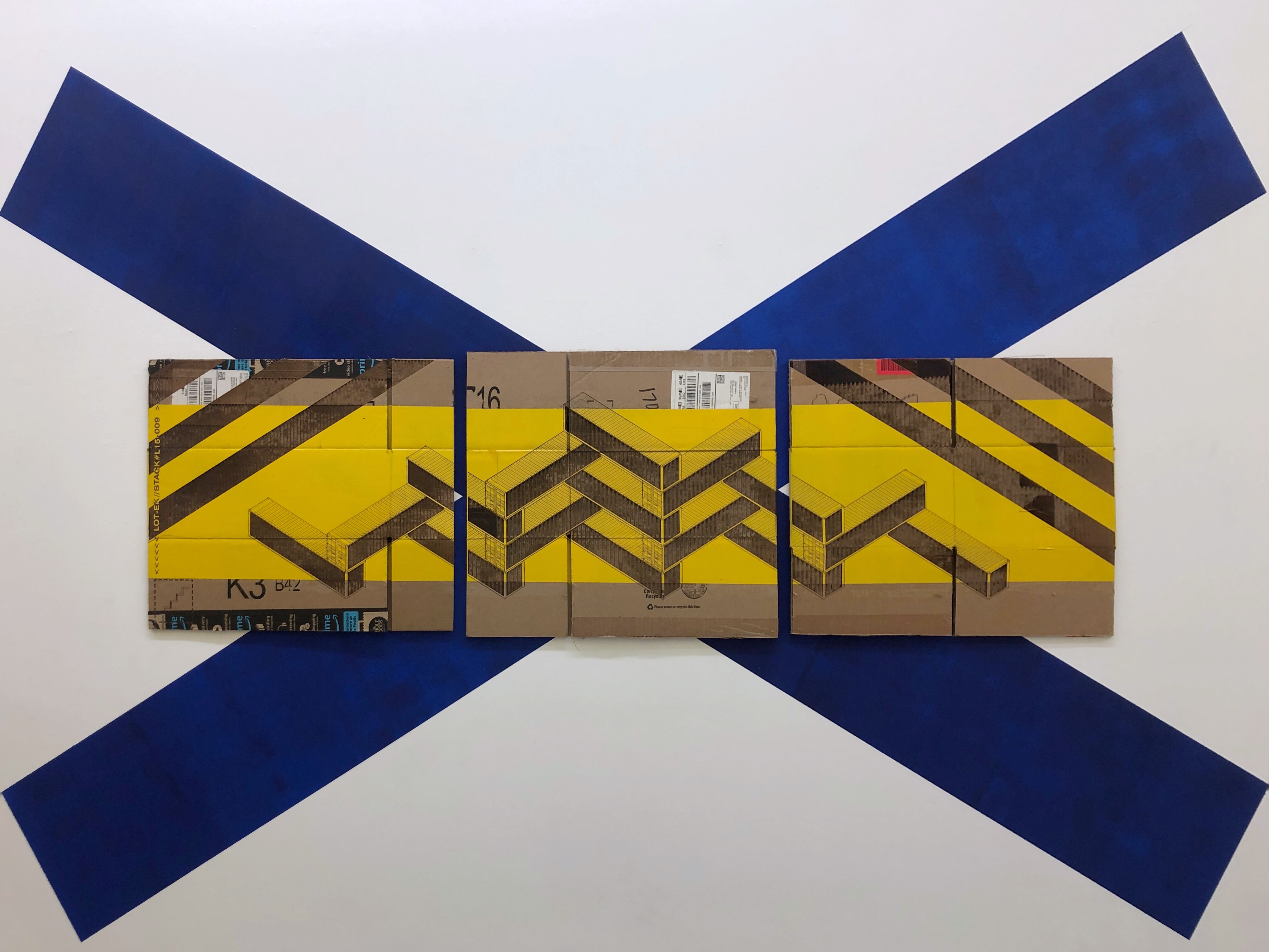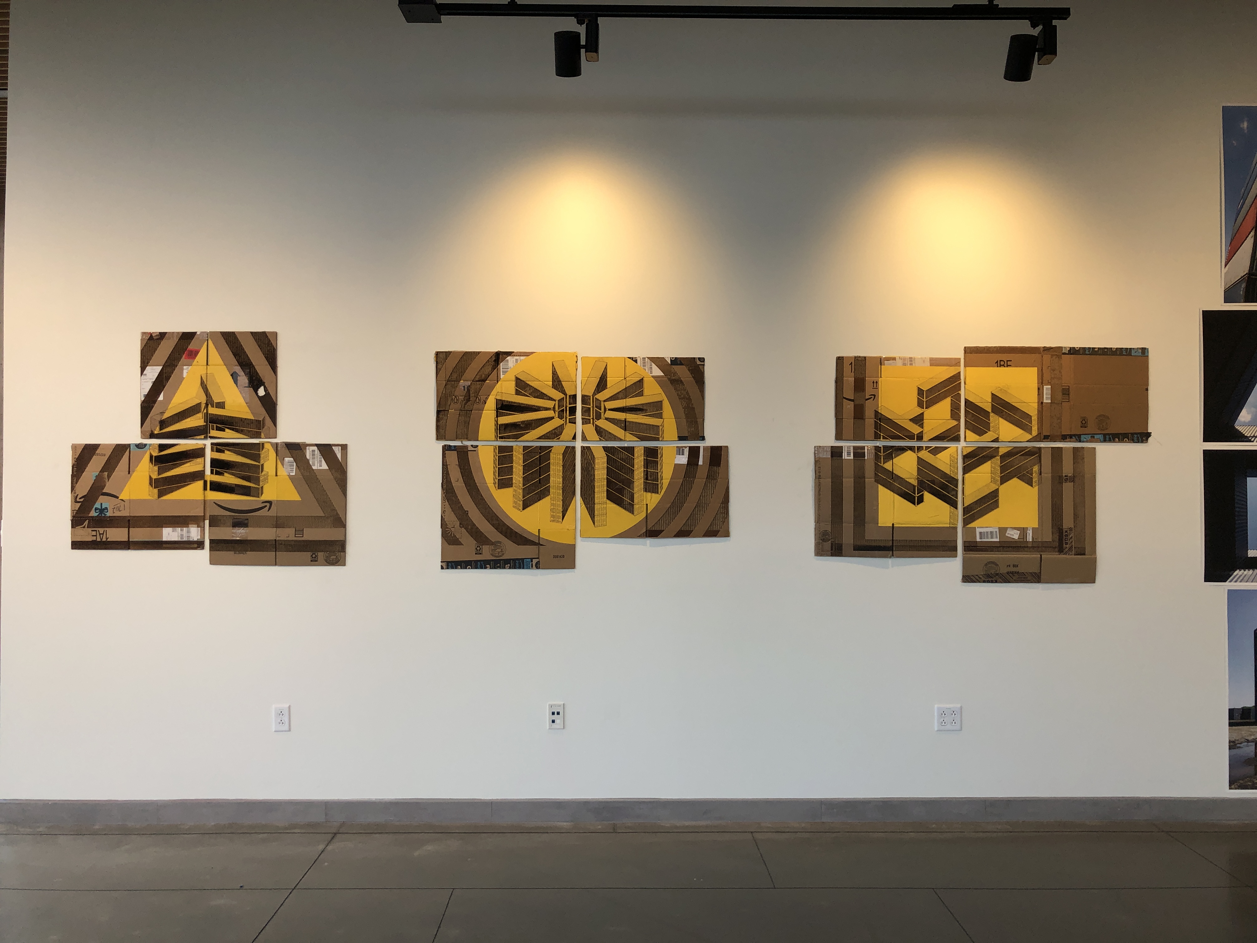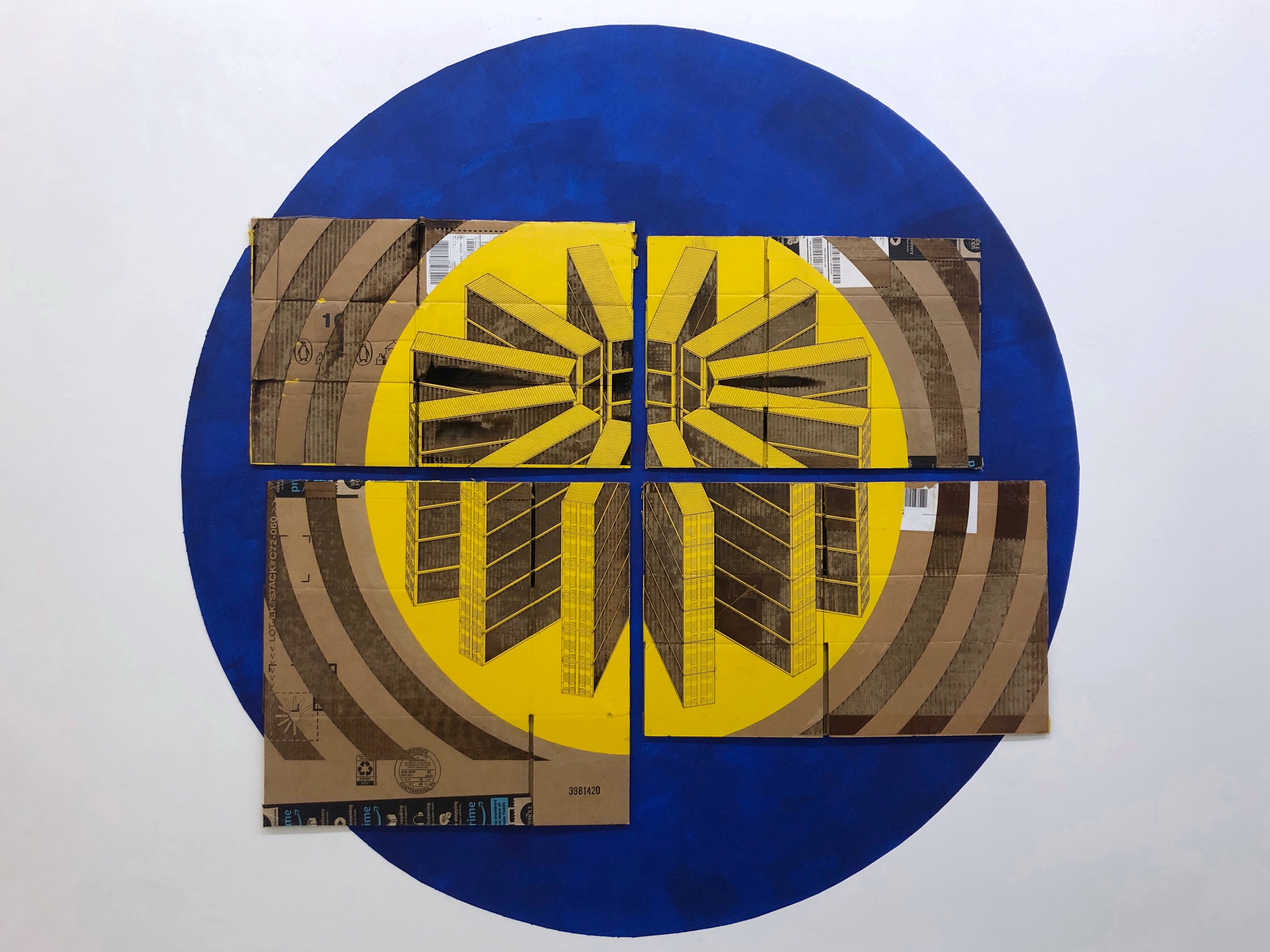 STACK / CUT employs two verbs: to stack and to cut. Layers or “additions” are stacked—for example, as actual and rendered stacks of industrial shipping containers—while actual and rendered “subtractions” / removals are cut from the same. Altogether, works in STACK / CUT are elements of an atlas-like inventory of possibility delimited by a set of given parameters. The geometry of minimalism is cut into or transliterated onto shipping containers—circles, squares, and triangles: alphabets dreaming of potential volumes and spaces.