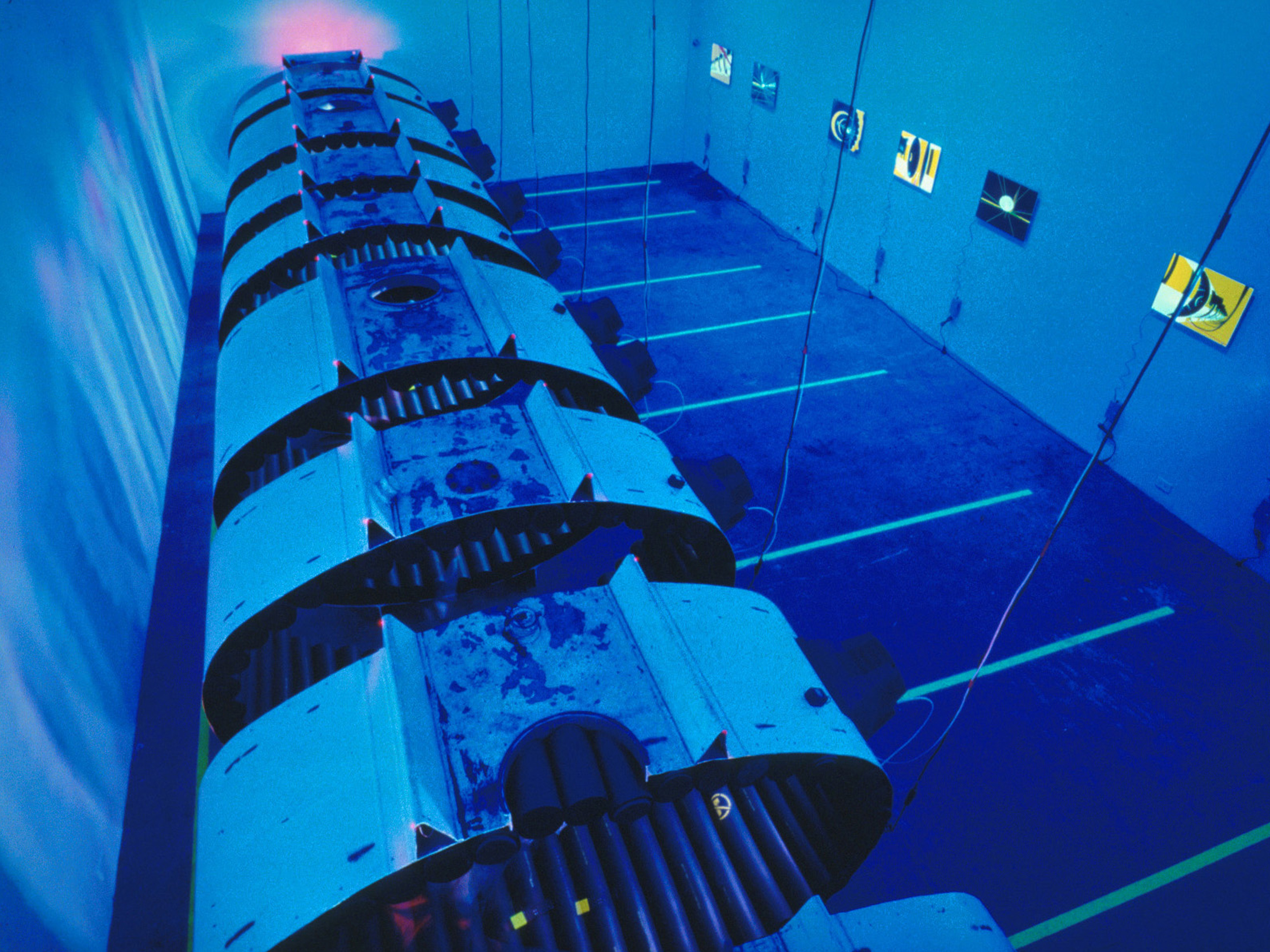 TV-TANK transforms a petroleum trailer tank into a set of floating section suitable for lounging and watching television. The 35 foot long aluminum tank is sliced into eight rings. Each module is lined with rubber tubing and equipped with 26” flat screen televisions. Viewers lounge in the privacy of single or double sections, while experiencing the once-hidden interior of the entire oil tank, animated by the flicker of television light. Sections can also be extracted to become individual viewing modules.